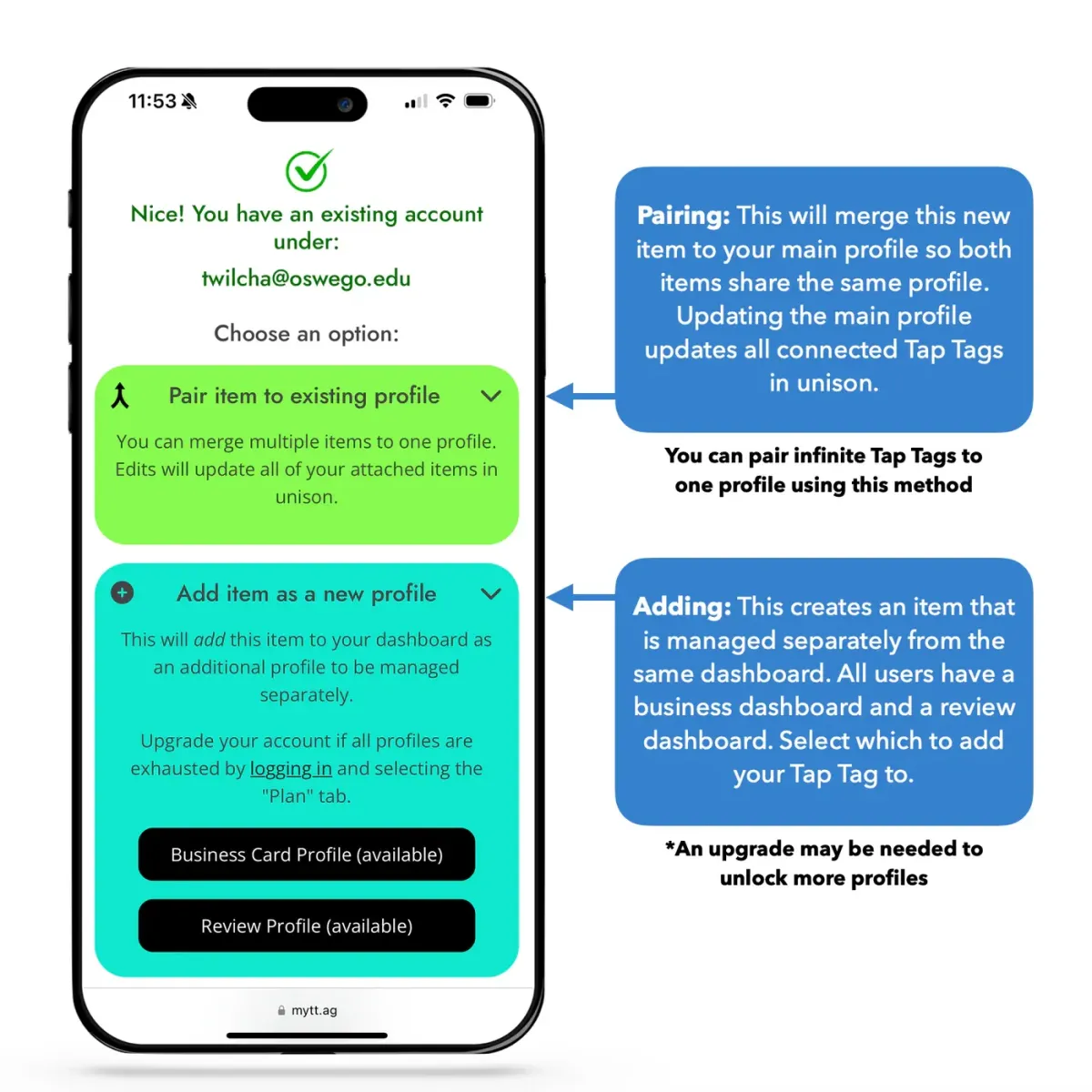 Pair: This will merge this new item to your existing profile so both profiles update in unison, both serving the same profile. See full direction on pairing here.